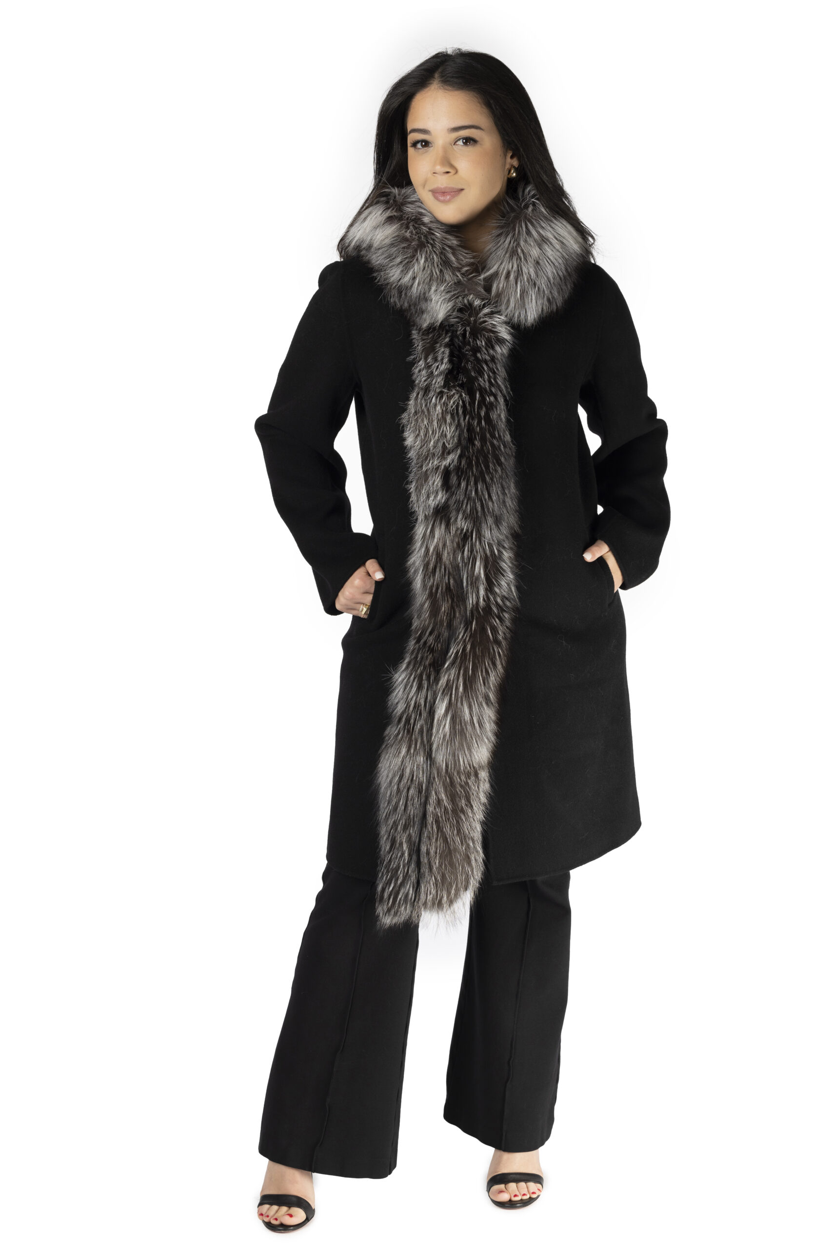 This sophisticated black wool coat features a plush silver fox collar, blending timeless elegance with luxurious warmth for winter layering.