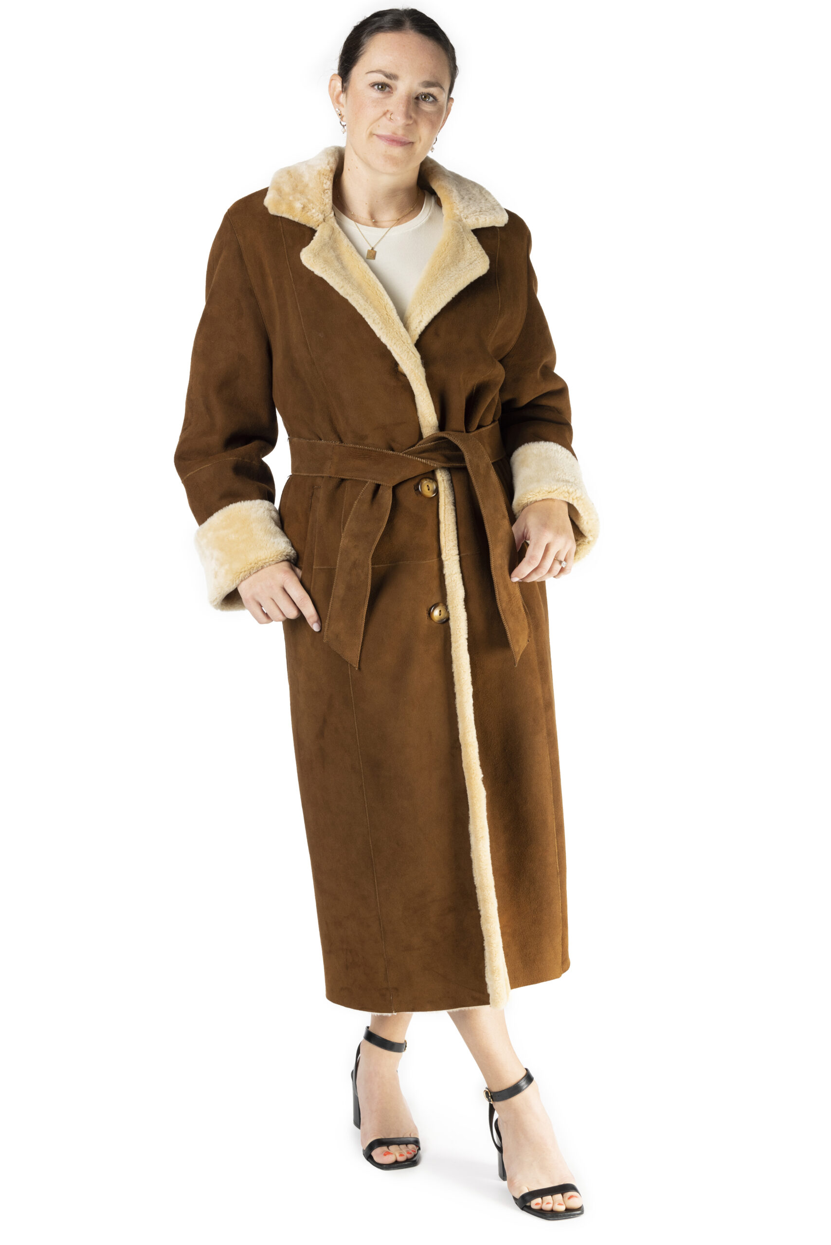 This classic brown shearling coat offers warmth, durability, and refined style, making it an essential for cold-weather dressing.