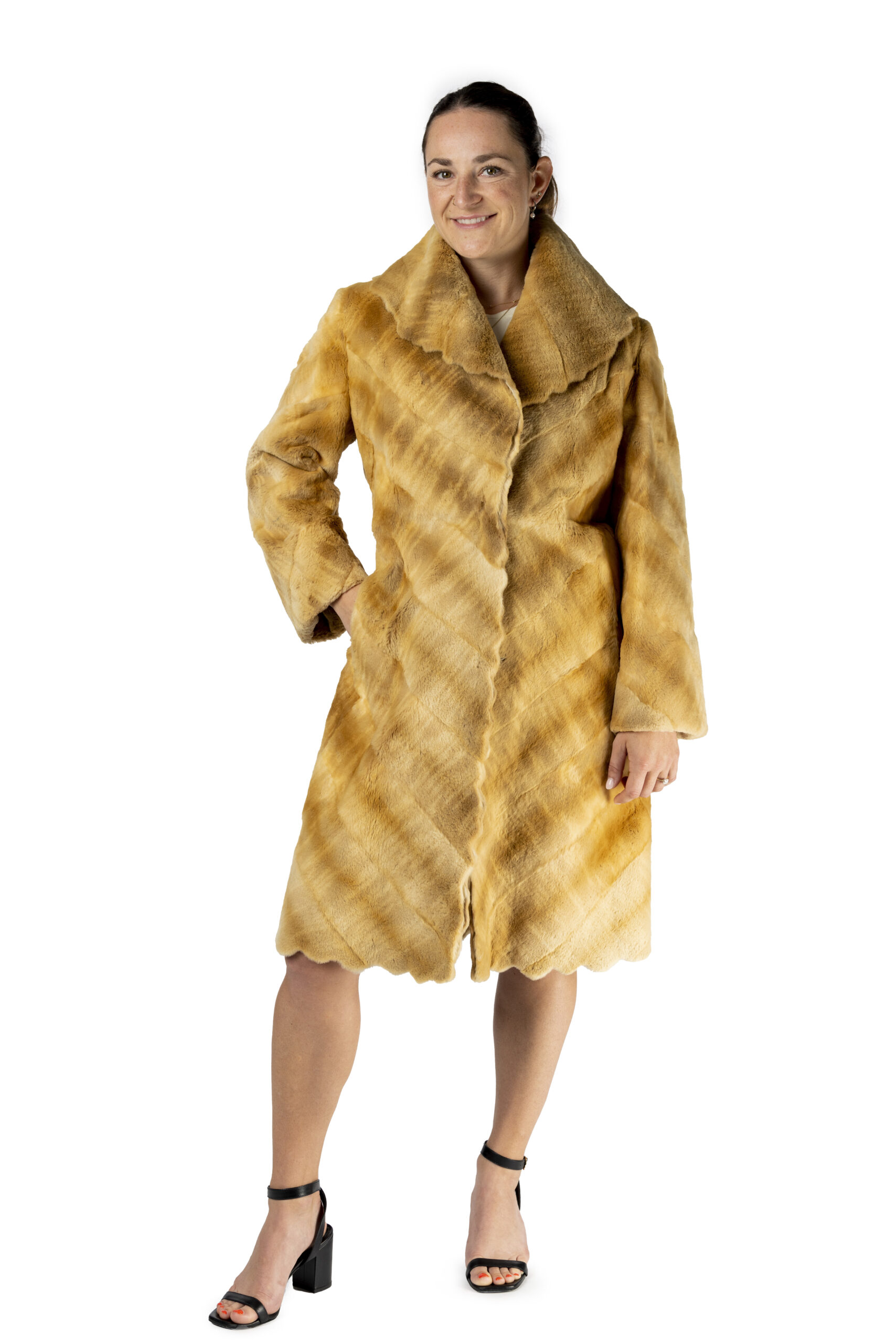 Elegant and soft, this tan sheared mink 3/4 coat combines warmth and timeless sophistication, making it perfect for layering over casual and formal winter looks.