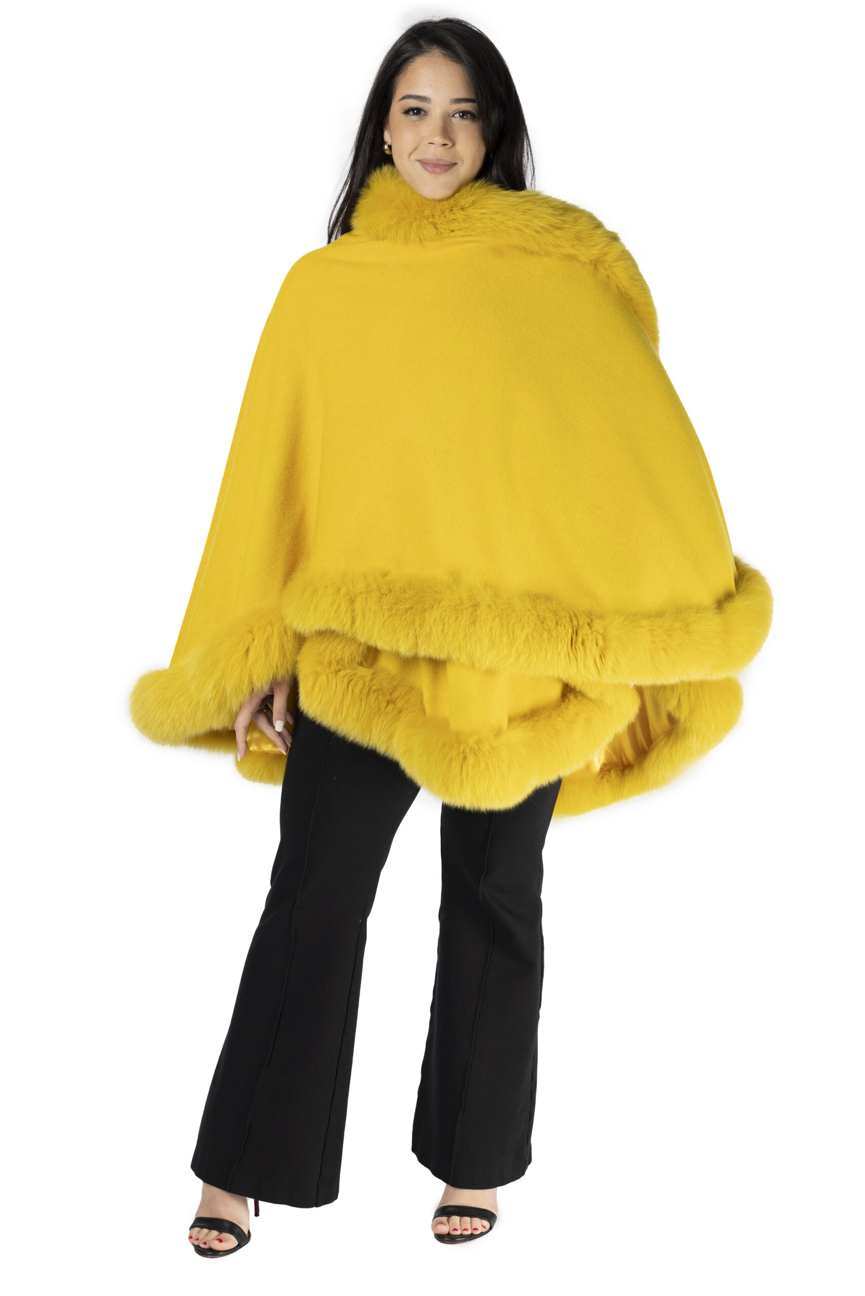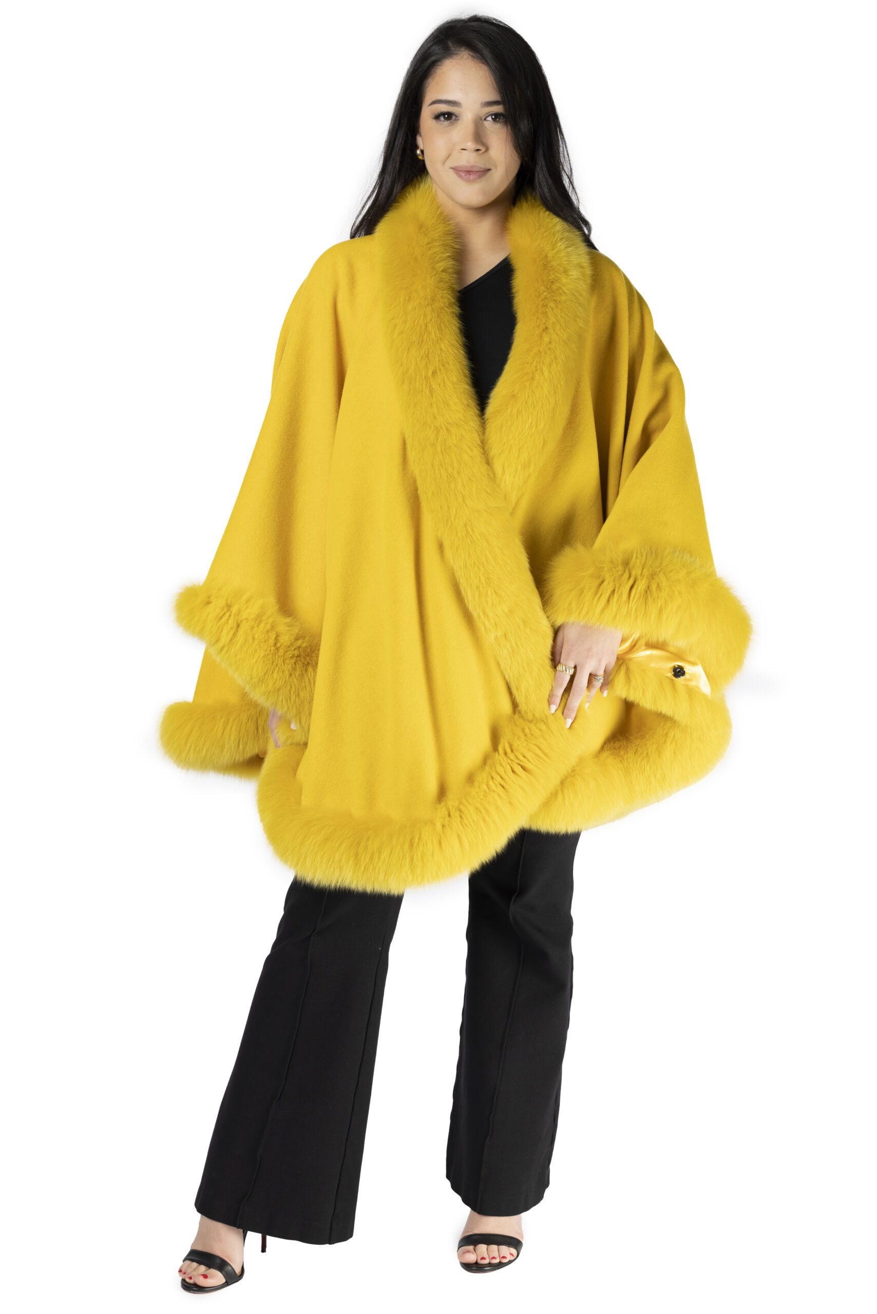 This vibrant yellow wool cape with matching dyed fox fur trim brings warmth, color, and playful sophistication to your winter wardrobe. A bold choice for any occasion.